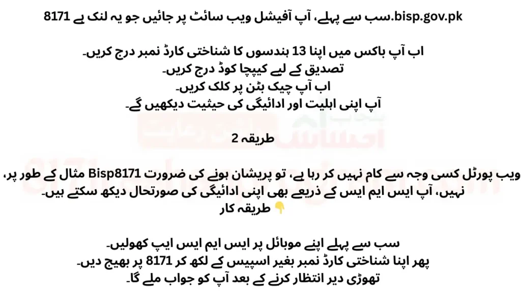 For example, if the Bisp8171 web portal is not working for some reason, then no need to worry, you can also check your payment status via SMS.
